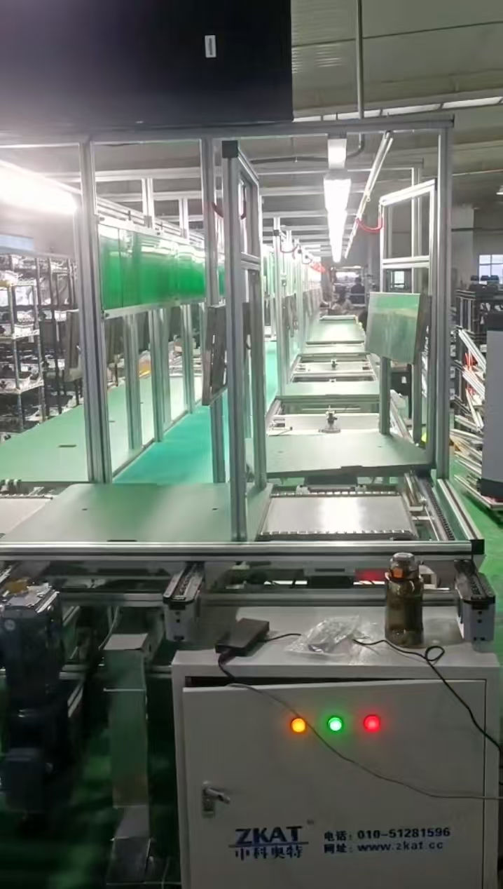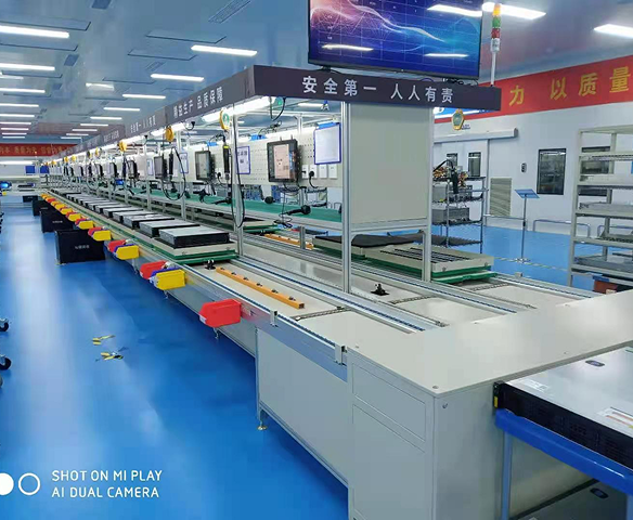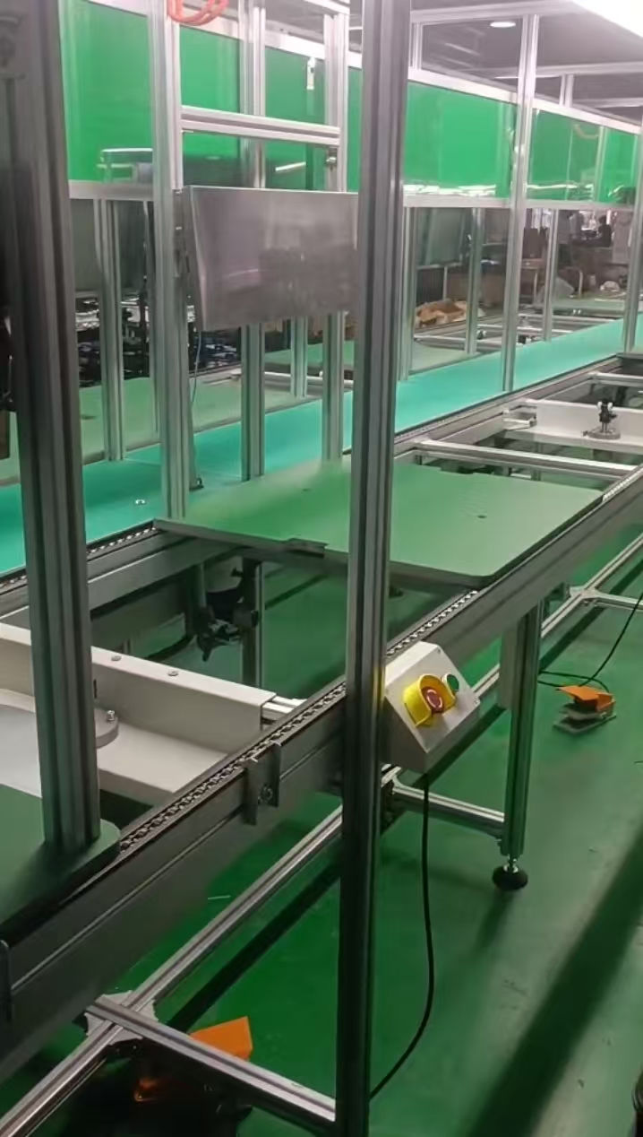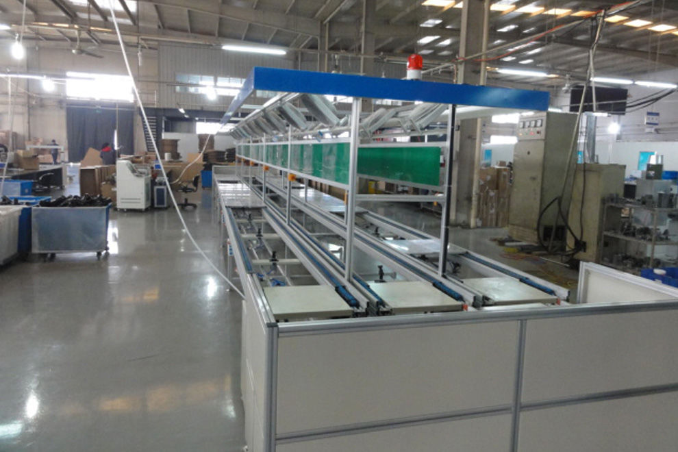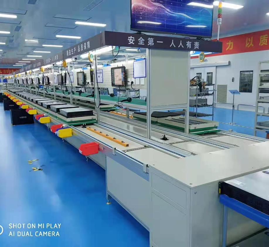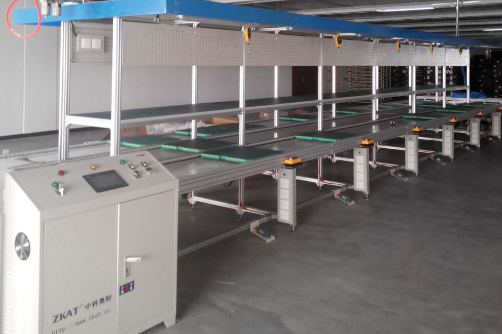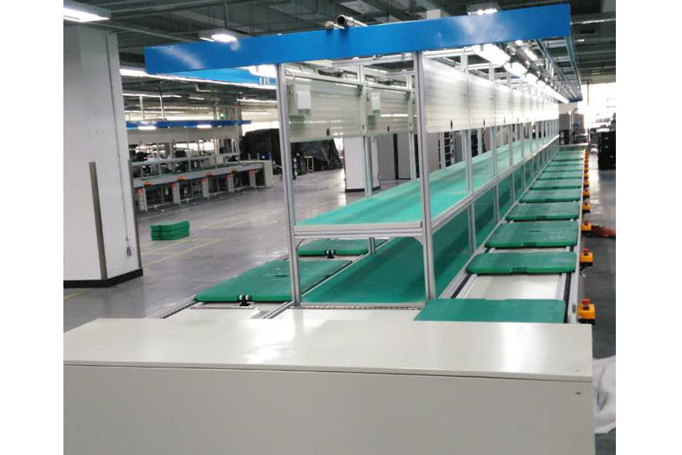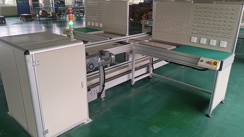 倍速链装配线由动力系统、控制系统、输送链条、工装板、阻断器、灯架照明、风扇、铝型材框架组成,另行配备了独立工作台、电源插座、气路辅助设施。另外配置升降机接送可以实现双层和多层输送,达到既输送又储存的目的。倍速链输送线配置直角移栽机,可作平面转向输送,可以使工装板在一个平面4框内循环输送、循环使用不下线体。